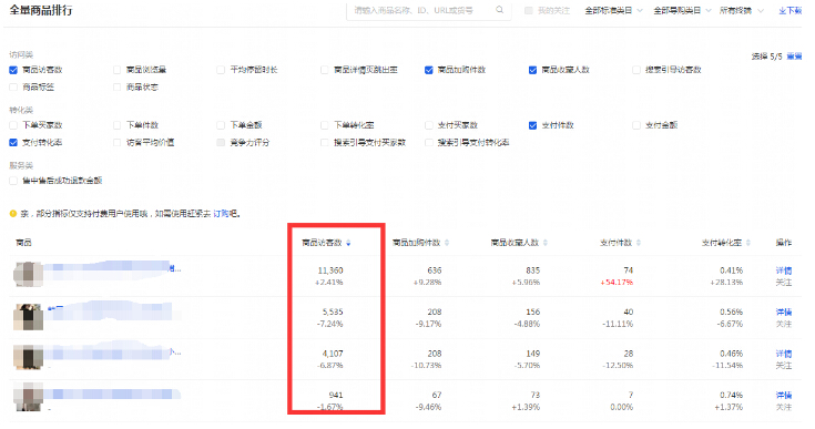 把鼠标往下滑—看到全量商品排行—期选择7天—将访客按照从高到低的顺序排列